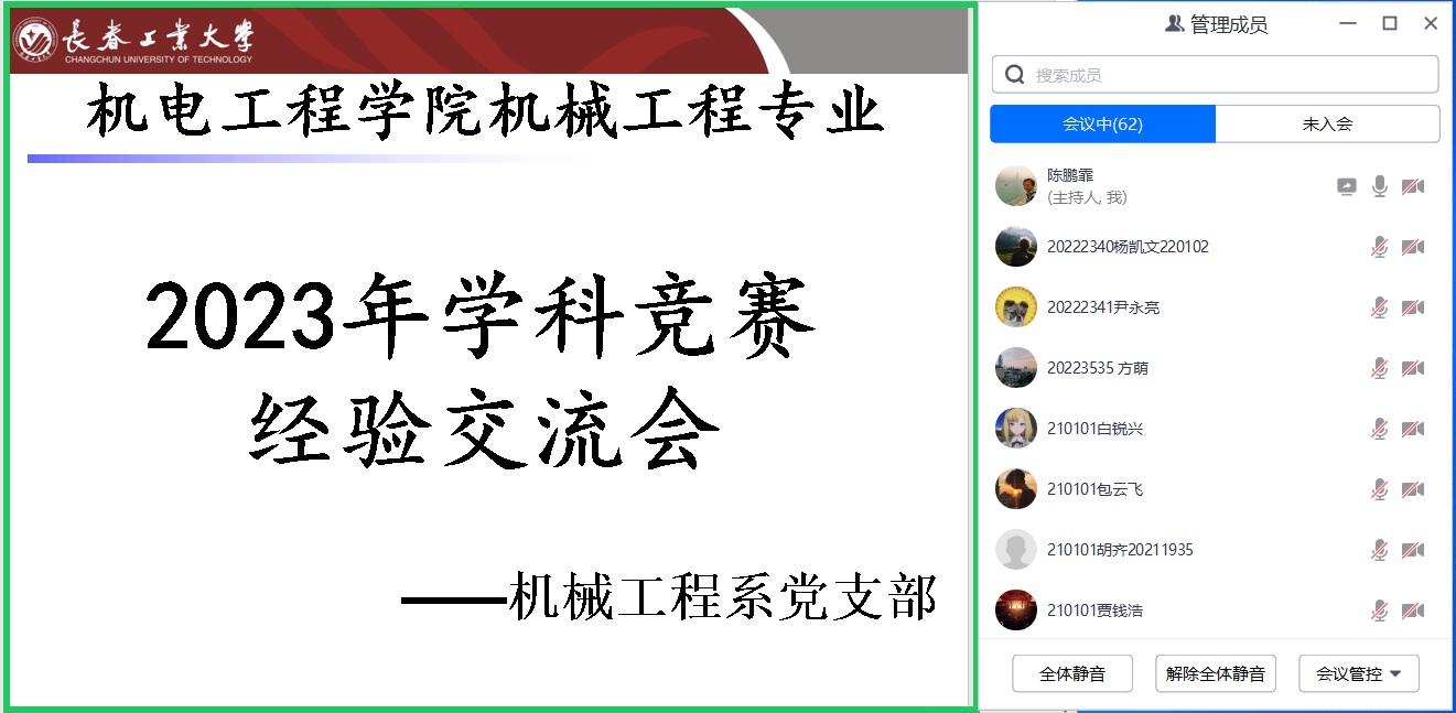 2023年10月23日,机械工程系支部书记陈鹏霏通过腾讯会议线上组织召开“机械工程专业学科竞赛经验交流会”。邀请到该专业已考取西安交通大学的谭鸿强同学与同学们交流参加专业学科竞赛的经验和心得,以及学科竞赛经历对专业学习、考研就业的积极作用。