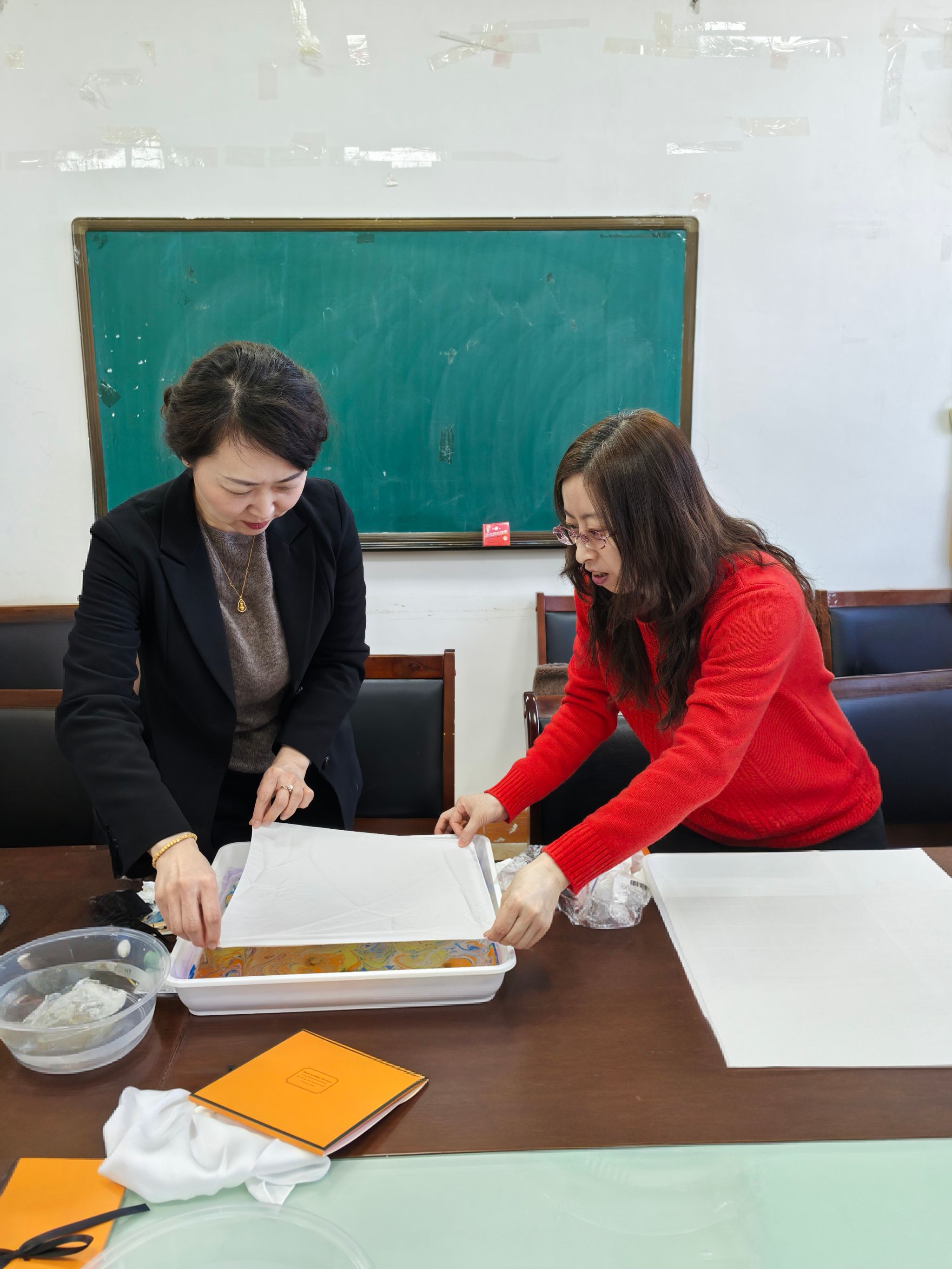 在了解了基本技法后,大家纷纷化身“水中艺术家”,跃跃欲试。她们小心翼翼地在水面上滴洒着五彩斑斓的颜料,用小棒或画梳轻轻拨动、勾勒,水面瞬间幻化出或如流云、或如涟漪、或如山水的抽象图案。当洁白的丝巾平缓地覆盖水面,吸附住那绚丽的色彩与纹理后,再缓缓提起,一幅幅独一无二、充满想象力的水拓丝巾作品便跃然眼前。看着自己亲手制作的丝巾,从素白到绚烂,老师们的脸上洋溢着惊喜与满足的笑容,现场气氛温馨而热烈。