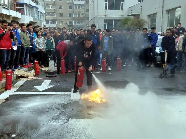 200余名学生已经全部到达指定场所。下午1点钟,演练正式开始。首先是工程训练中心2楼机房发现火情,随着滚滚浓烟从窗口散出,警笛声响起,学生陆续从各楼层实验室和机房有序疏散。灭火组和疏散组的同学相互配合,待到保卫处消防人员到达后撤离。几分钟后,200多名学生全部安全逃离现场,“火情”也被成功扑灭。疏散演练结束后,校保卫处的工作人员点燃在指定空地上准备好的木材,详细讲解并演示了灭火器的使用,最后同学们有序地使用灭火器进行灭火体验。
